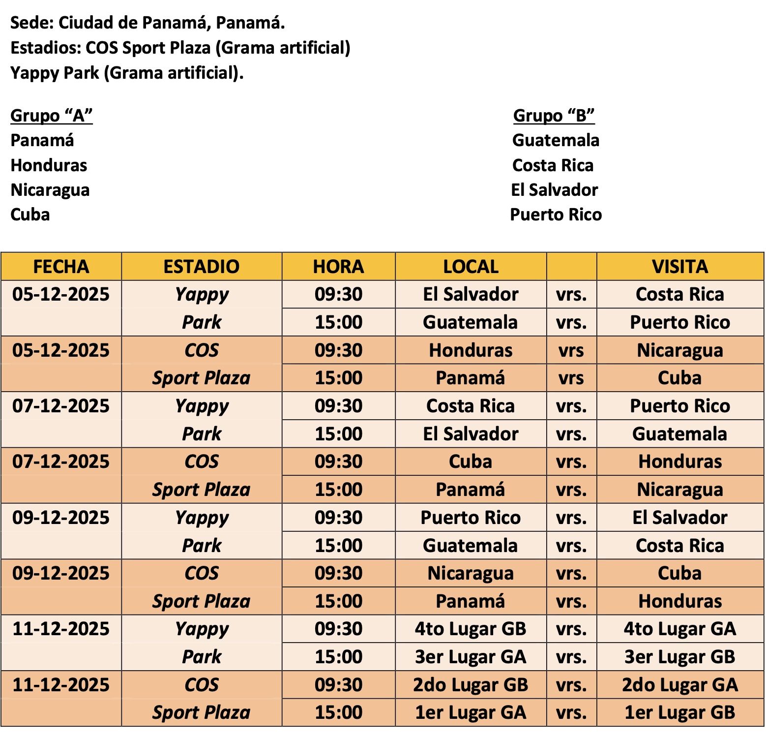 - Los dos ganadores de grupo disputarán la final 11 de diciembre a las 15:00 Hora panamá